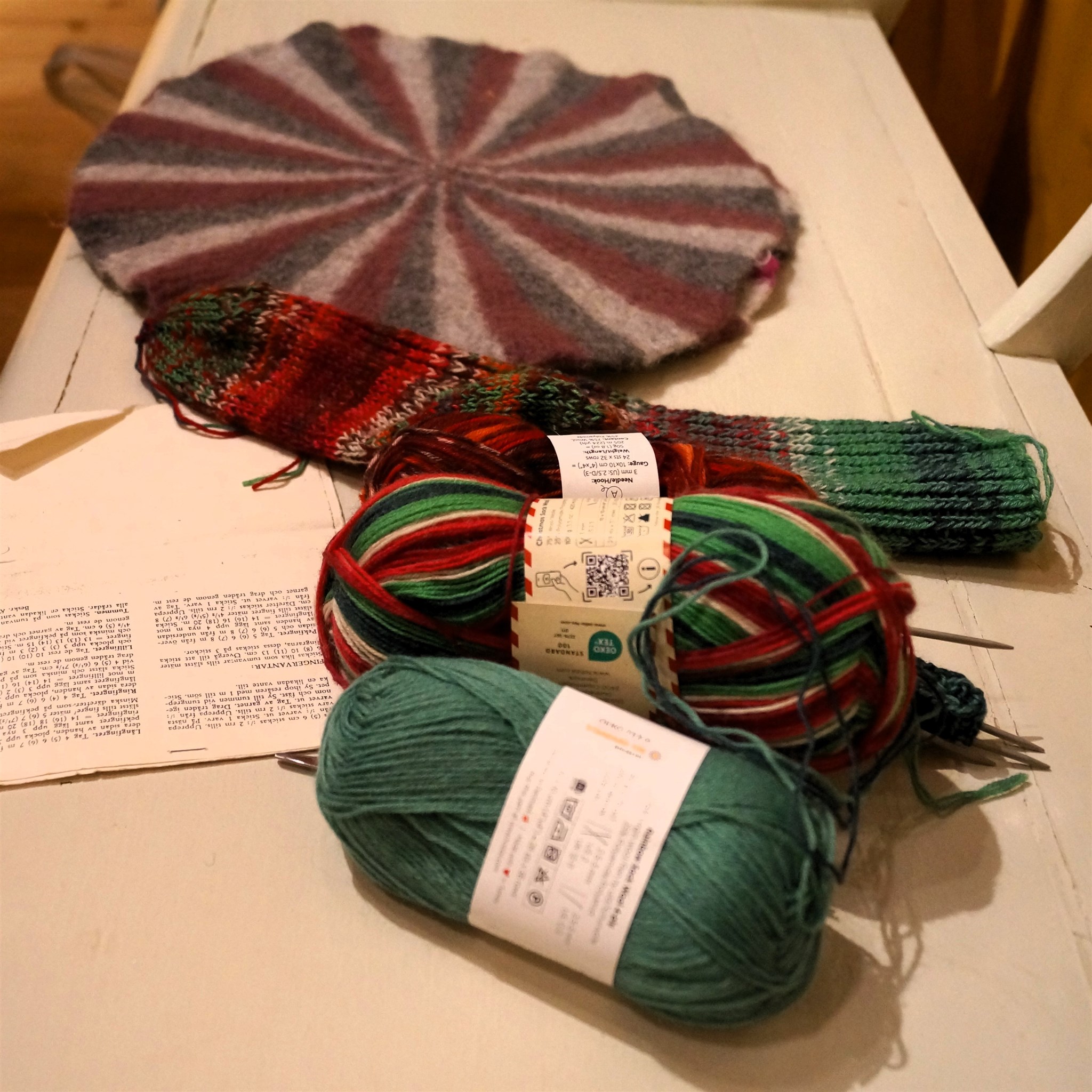 Krokade och nålbundna vantar från Birgitta Wolters tillverkning.