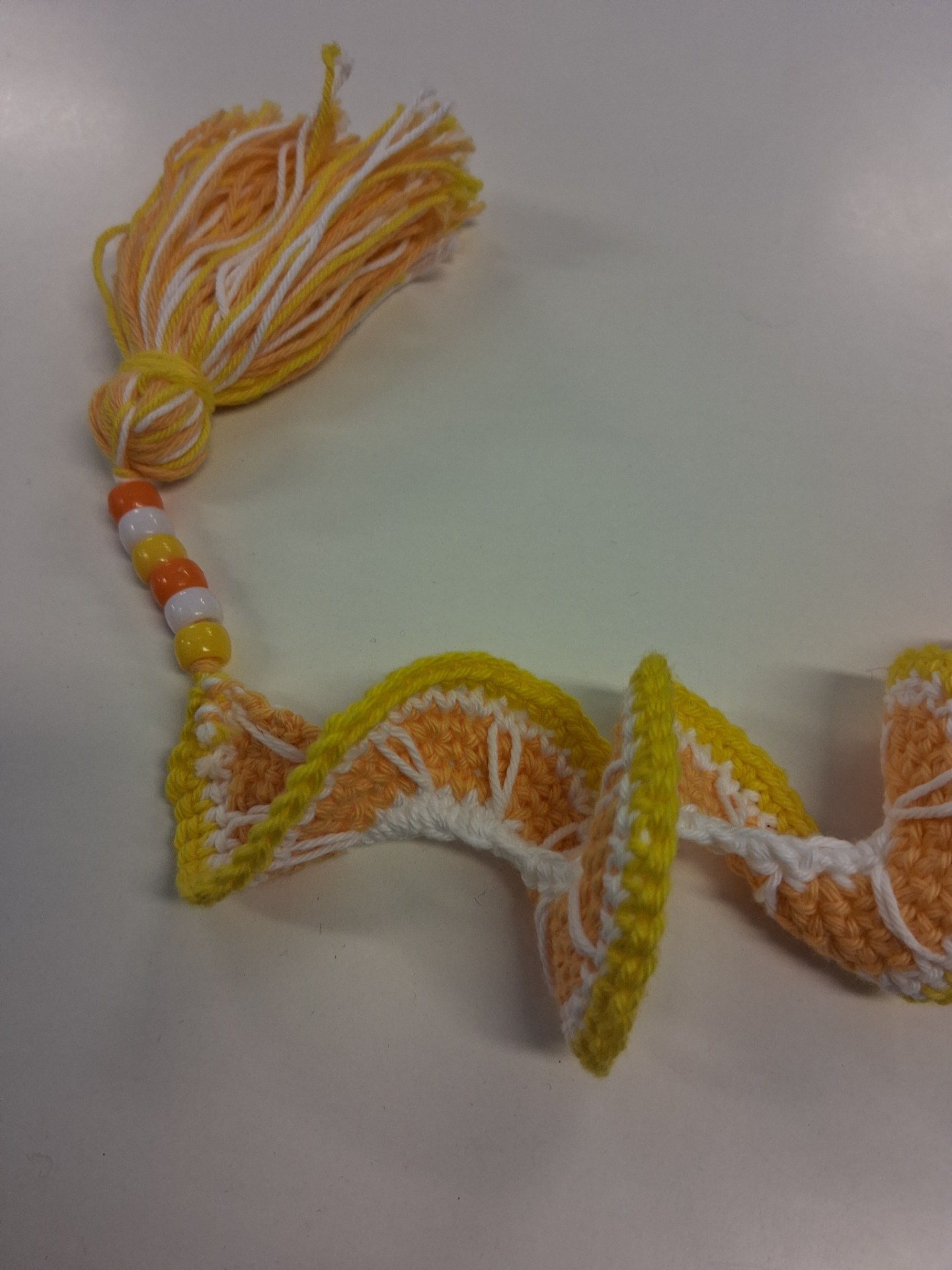 Vid årets första kvällsträff så tillverkades virkade mobilsnurror. Marianne Strandlund visade hur det går till.