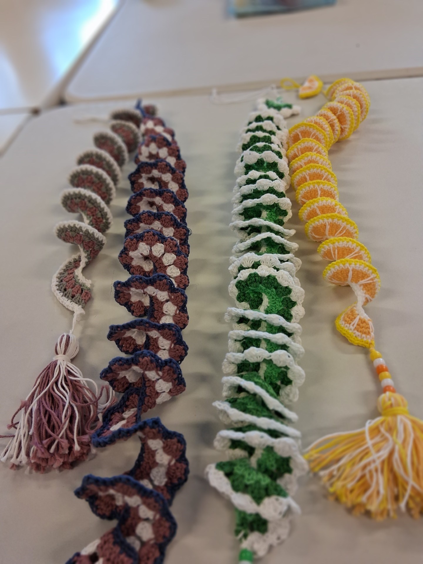 Vid årets första kvällsträff så tillverkades virkade mobilsnurror. Marianne Strandlund visade hur det går till.